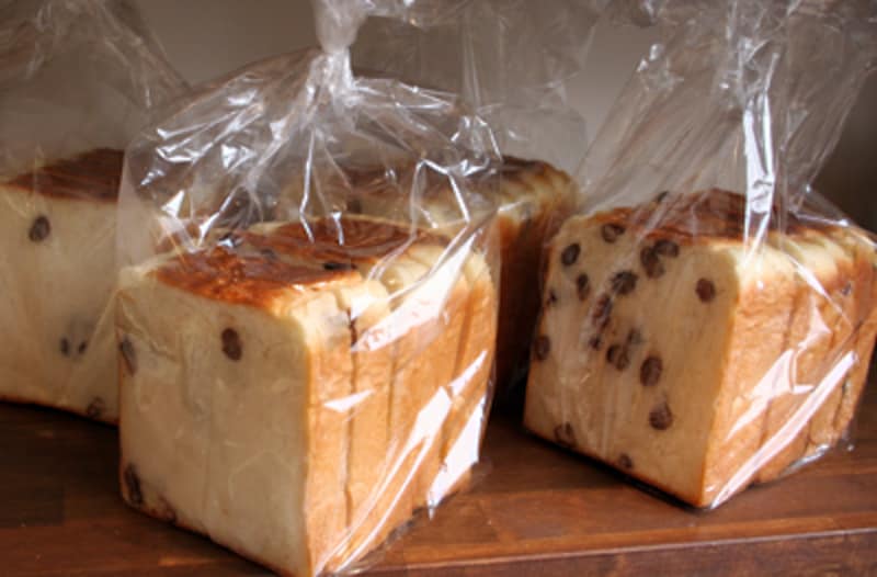 | 山型食パンの生地にチーズを入れた「チーズブレッド」、ごま入りの生地にたっぷりのサツマイモの「おさつブレッド」(各200円) |