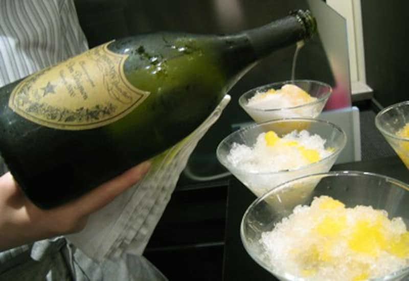 これからの季節におすすめの、ちょっと華やぎのある大人のスイーツは、赤坂でも人気の、ドン ペリニヨンのかき氷。写真はエルダーフラワーとフレッシュマンゴーのかき氷で、他にもマスカットやイチゴなどのフルーツが選べます。シロップのようにしてドン ペリニヨンをまわしかけてくれるのです。