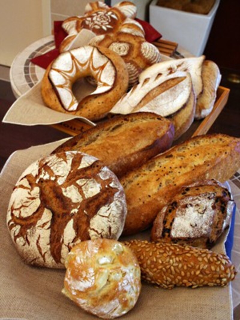 | ドンク青山店で再現された作品とこの日のために焼かれたパンはこのほかにバゲットやデザート用のパンもあった。美しいクープ(切れ込み)や飾り粉に注目 |