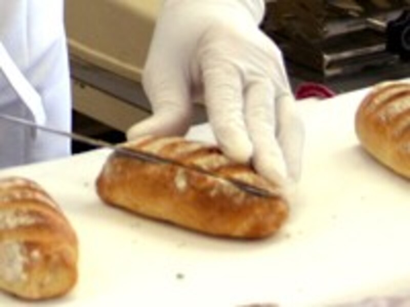 「イェーガーブロートヒェン」は上部より下部が多くなるように60度の角度で切り込みをいれ、有塩と無塩を半々にねり混ぜたバター(塩気がほどよい)を塗って、具材をはさみます。