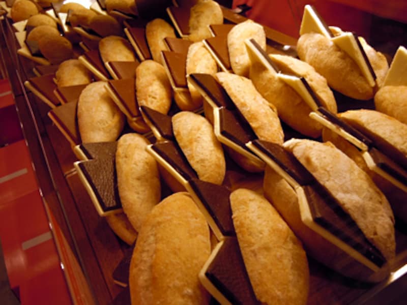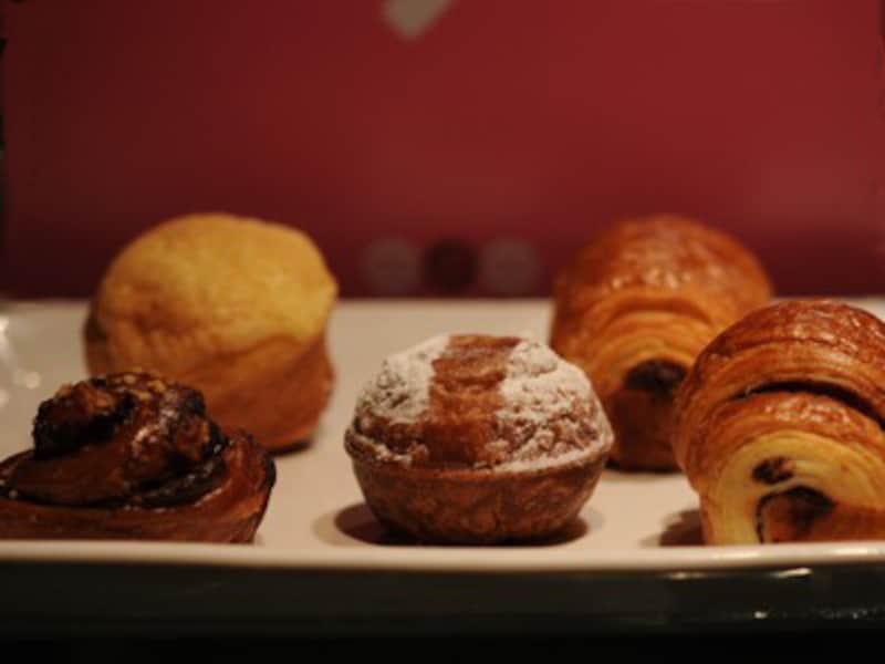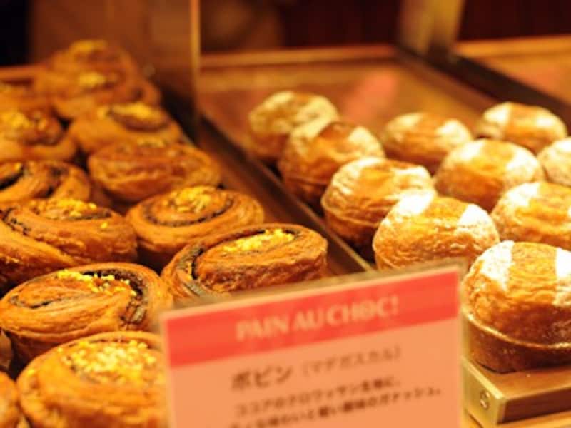 写真のものは、左下から時計回りにボビン(マダガスカル)、プチブリオッシュ(ポワブル)、パンオショコラ(カラカス)、クロワッサンショコラ(カラク)、ロンド(フランボワーズ)。カッコの中は使用されているガナッシュ(沸騰させた生クリームをショコラと混ぜ合わせて固めたクリーム)の種類で、カカオ成分の多い上質なショコラとフルーツやスパイス使いが絶妙です。