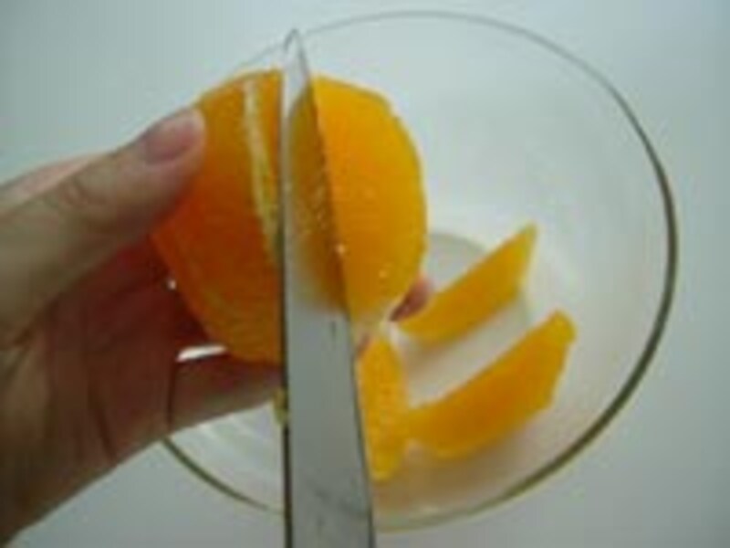 ◆3 ◆ オレンジは一房ずつに切り、イチゴは半分にカットする。 キウイ、スターフルーツをスライスする。 リンゴはスライスして、葉型に抜いておく。 |