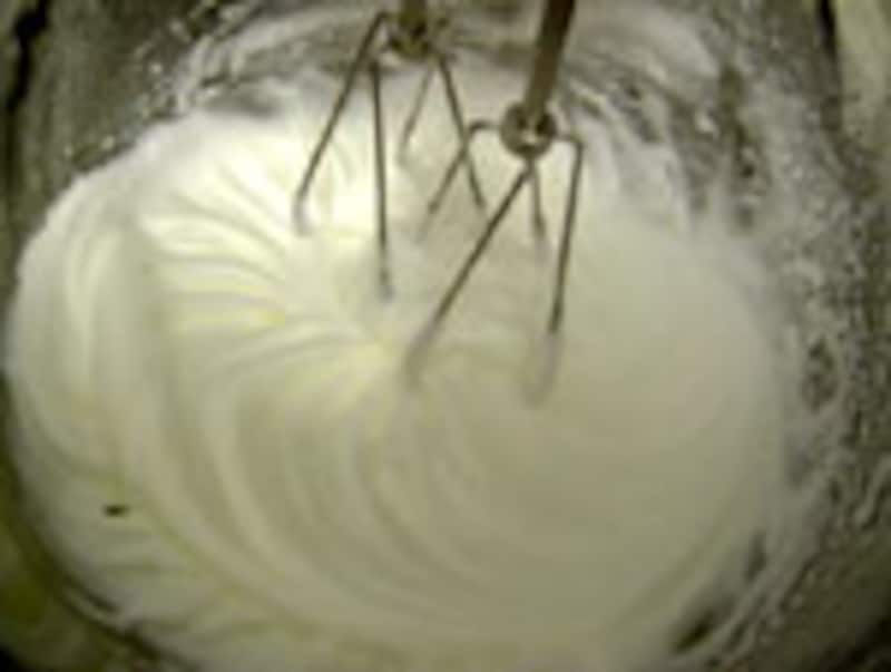 ◆2 ◆ 卵白に、グラニュー糖を3回に分けて加えてミキサーであわ立てメレンゲを作る。 *一度にグラニュー糖を加えるとあわ立ちにくいので注意。 |