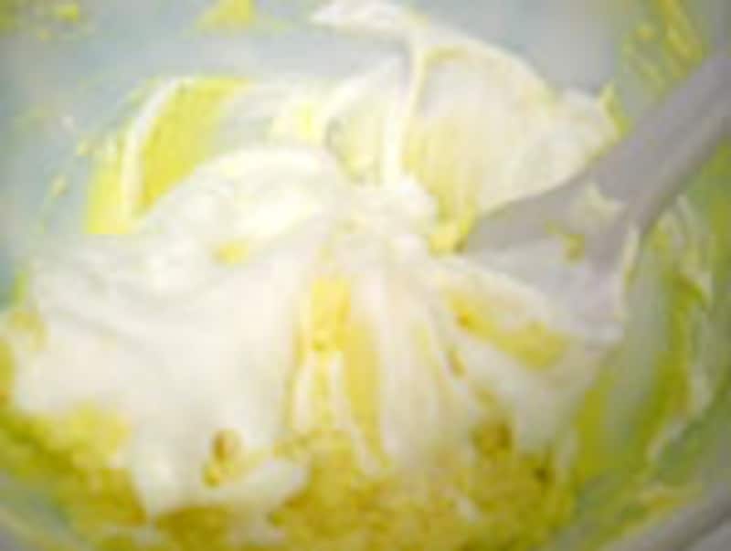 ◆3 ◆ 1のマスカルポーネ生地に2の卵白を3回に分けて加え、切るように混ぜ合わせる。 |