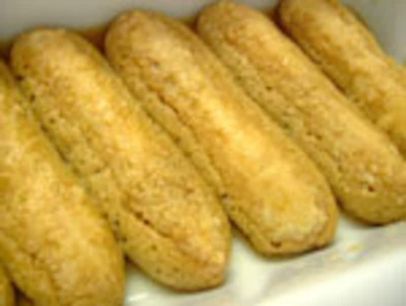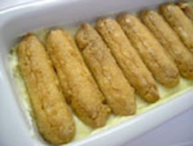 ◆4◆ エスプレッソとリキュールを合わせておいたものに、サヴォイアルディ(フィンガービスケット)を浸しながら器に並べる。 |