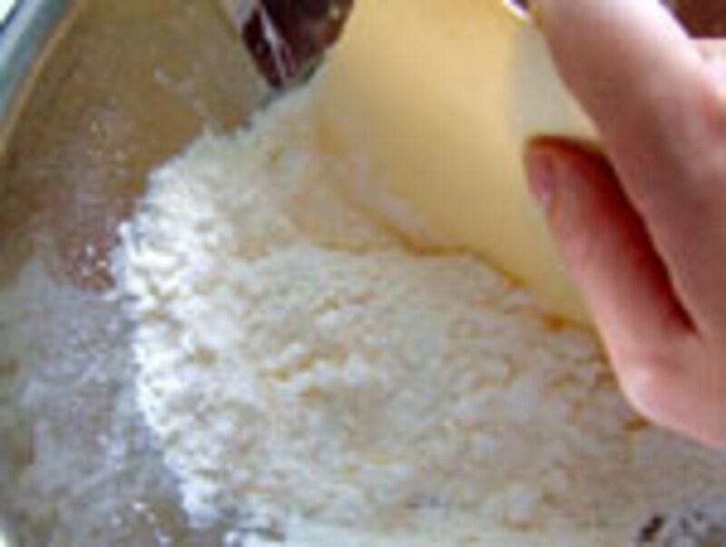◆2 ◆ 1cm角に切った無塩バターと砂糖、ふるった薄力粉を加えスケッパーで切るように混ぜる。 (スケッパーが無い場合は指でこすり合わせるようにしてそぼろ状にする。) |