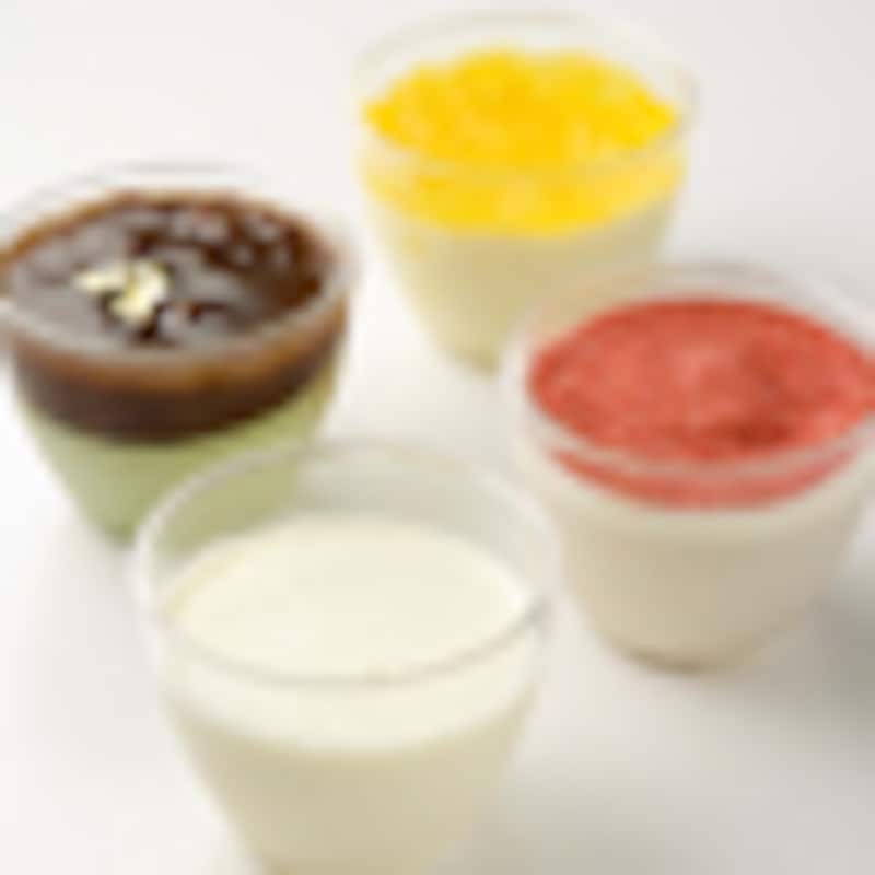 | (手前から時計回)天使のババロアプレーン 360円、“天使のババロア メランジェタイプ”抹茶 460円、“天使のババロア メランジェタイプ” マンゴー 460円、“天使のババロア メランジェタイプ” ストロベリー 460円(全て税込) |