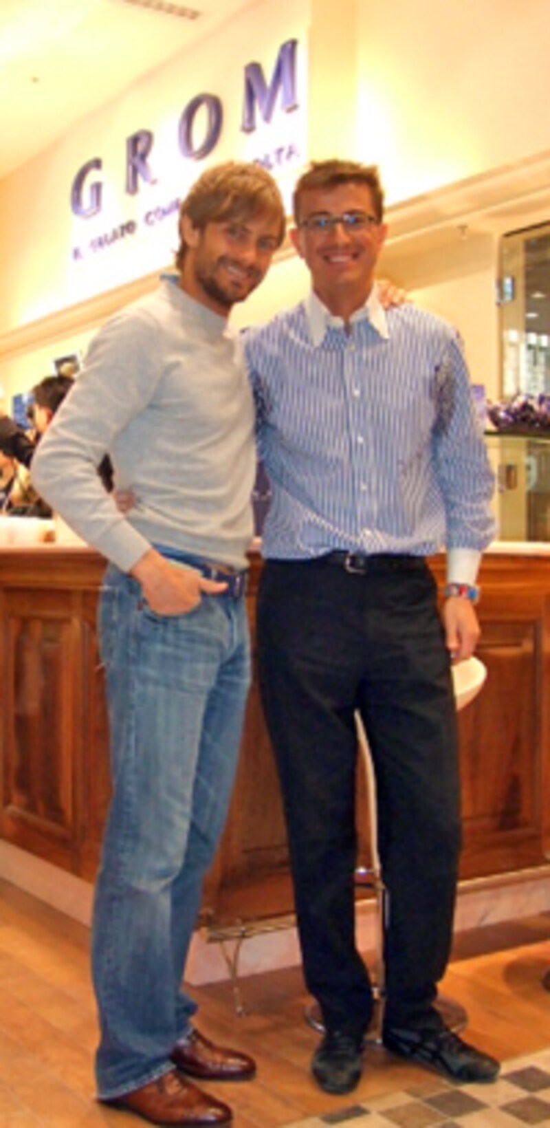 | フェデリコ・グロム氏(右)とグイド・マルティネッティ氏(左) 「GROMのジェラートならいっぱい食べても太らないよ!」と話すグロム氏。確かにお二人とも身長の高いスラリとされています。 |