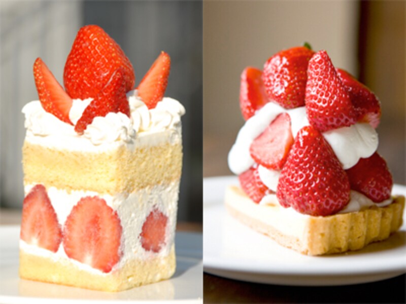 | <左>あまおうショートケーキのカット 800円(税込)/<右>季節の旬タルト(画像はあまおうのタルト) 990円(税込み)*メニュー内容、価格などは市場の状況、季節、時期などにより変動いたします。 |