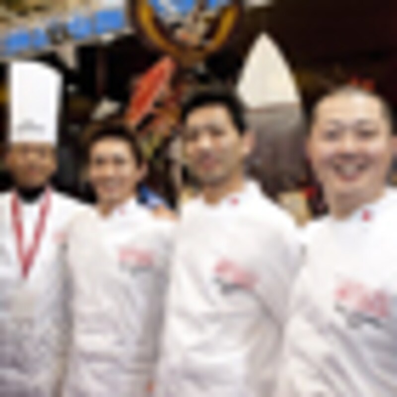 日本代表はル・ショコラ・ド・アッシュの若林繁氏(アントルメ・ショコラと飴細工のピエスモンテ)、 氷川会館の林正明氏(皿盛りデザートとチョコレートのピエスモンテ)、名古屋マリオットアソシア ホテルの山本健氏(アントルメ・グラッセと氷彫刻)の3名です。