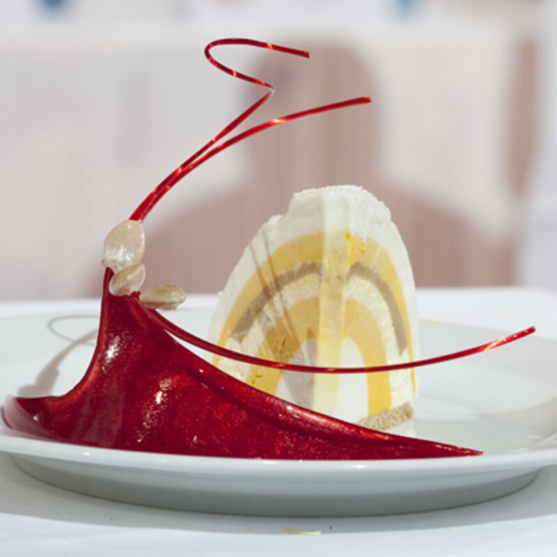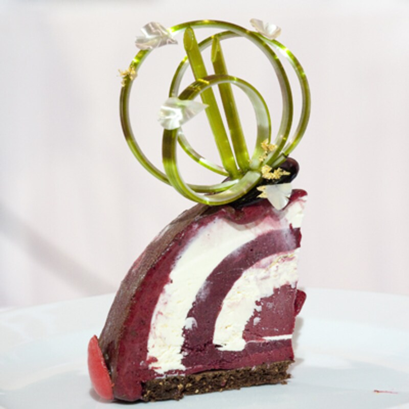 日本チームのアントルメ・グラッセは「美」と名づけられ、チョコレート風味のメランゲの上に、カシスとフランボワーズの2種類のソルベ、マスカルポーネのアイスクリームを重ね、花びらを思わせるフランボワーズのマカロンが飾りつけられています。カリフォルニア・アーモンドはメレンゲの材料として、また、マスカルポーネのアイスクリームの風味づけに使用されました。