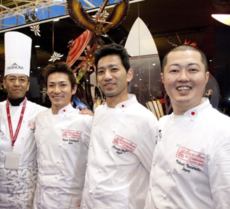 | 左から/団長パティスリー タダシ ヤナギの柳正司氏、ル・ショコラ・ド・アッシュの若林繁氏(アントルメ・ショコラと飴細工のピエスモンテ)、 氷川会館の林正明氏(皿盛りデザートとチョコレートのピエスモンテ)、名古屋マリオットアソシア ホテルの山本健氏(アントルメ・グラッセと氷彫刻) |