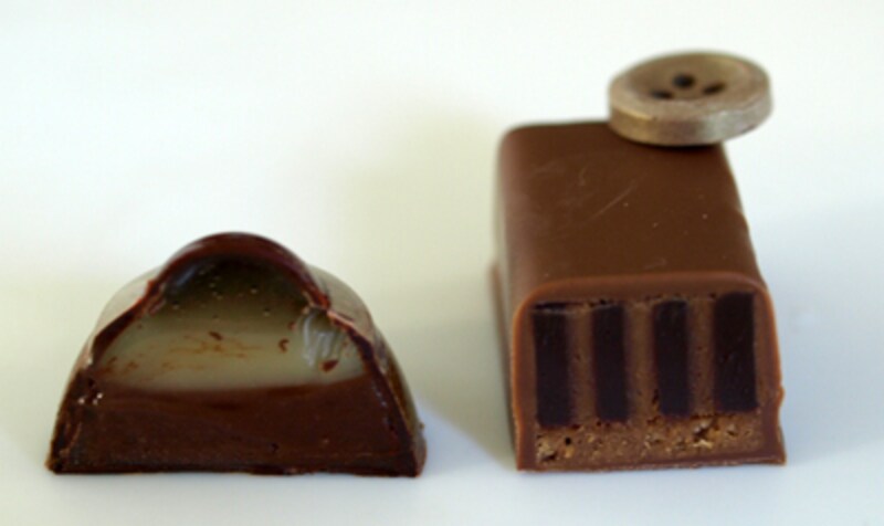 ウォールナッツのガナッシュとクランチの食感が絶妙。もちろんボタンもチョコレートで、食べることができます。断面がケーキのMODEと同じように縦のストライプが印象的。ミルクチョコレートウォールナッツのガナッシュが層になり、一粒でケーキのような美味しさ。