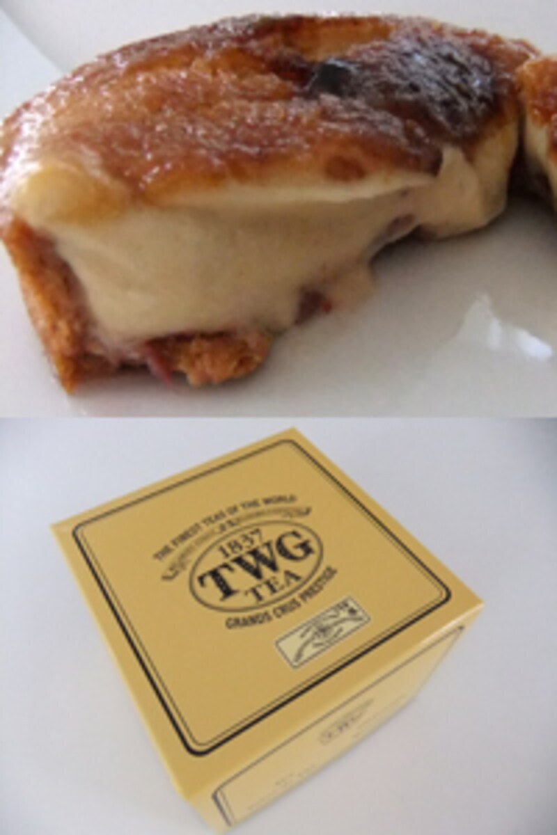 とろ~りと柔らかなカスタードクリームは、TWG TeaのVanilla Bourbon Teaで風味をつけられています。さらに、下にはワイルドストロベリーのコンフィが入り、酸味と爽やかなベリーの風味がアクセントになっています。クレームブリュレのように表面はカリカリにキャラメリゼをほどこされ、薄めのタルト生地が繊細さを添えています。