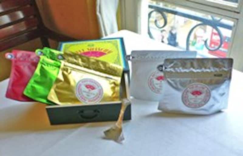 木箱をひらくとオルゴールが鳴り始め、中にはカラフルなティーポシェットにひとつずつ異なるお茶が収められています。ショパンのノクターンにのせられて気持ちを1930年代にタイムスリップ。どれもマリアージュ フレールの新作で通常の量り売りはないそうです。