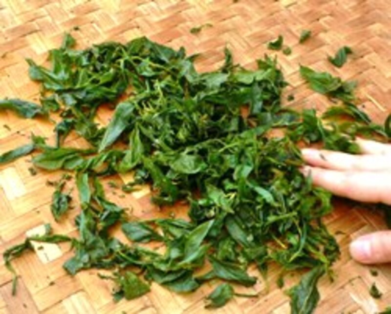 揉んでいるうちにきれいな黄緑の生葉は緑色を帯びて、ねばねばとした感触が手のひらに現れてきます。生の、青い、苦そうな香りがふんわりと立ち上がってきます。まだ紅茶というには程遠い。