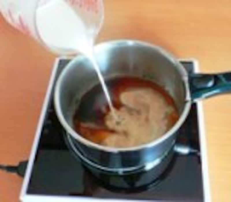2.水が沸騰しかかったら、茶葉は少し多めにティースプーン山盛り2杯を入れ、ティースパイスを小さじ2分の1くらい入れる。火を少し弱め、約2分煮る。