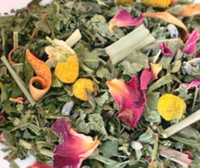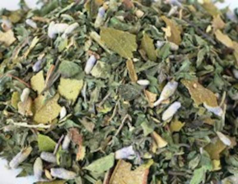 | 「モーニング アフター」。ペパーミント、生姜、レモンマートル、ラベンダーのブレンド。生姜が柔らかく効いて舌がキュっとするスパイシーテイスト。 |