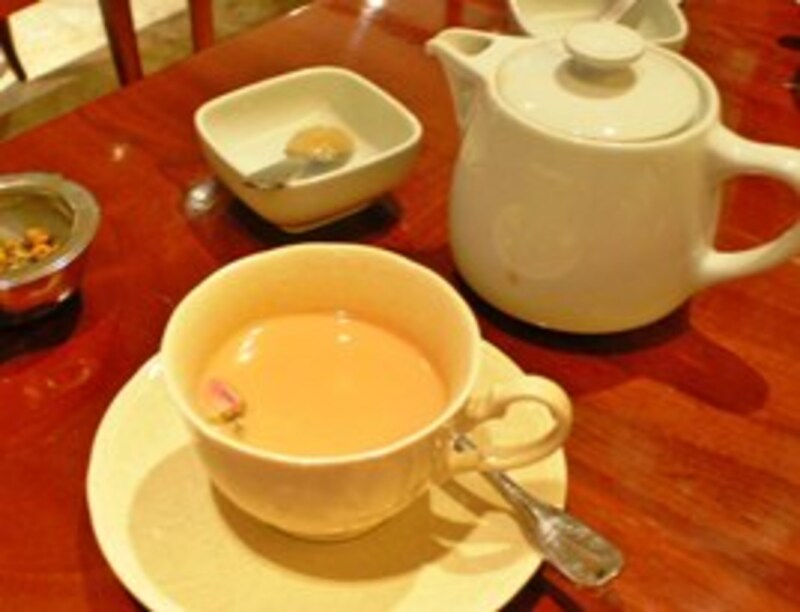 | ダマスクローズのつぼみが浮かんだテ・ラッテ・ディ・ローザ。砂糖でほんのり甘みが加えられています。麦飯石のティーカップでまろやかな味に。 |