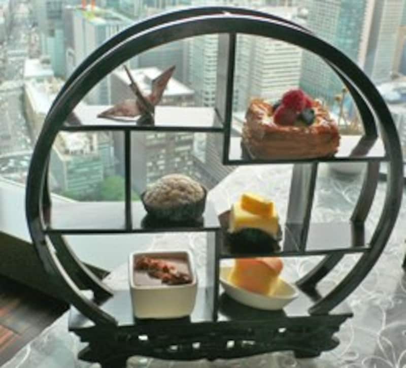 お口直しとして次に運ばれるストロベリー、ラズベリー、ライチのゼリーに続いて、最後のプレートはアジアンテイストの飾り棚にかわいく美しく配置されたスイーツ。シュークリーム、パイ、パッションフルーツのムース、チョコレートのジュレ、マンゴーチーズケーキの5品。香港に本社を置くホテルとしてアフタヌーンティーにも東洋のテイストを加えられたとのことで、総料理長さん自らが探し出したスタンドは、どこか遠い異国のものでありながら親しみが感じられるとともに、アジアンアフタヌーンティーとして新鮮です。