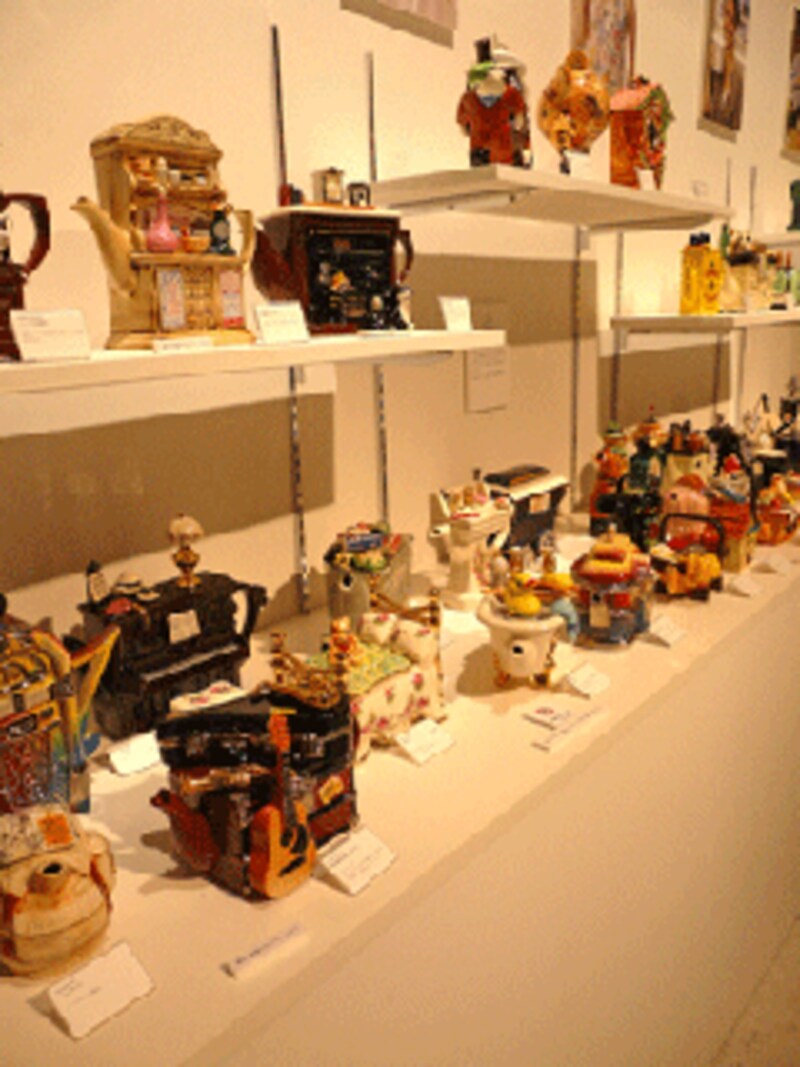 旅行鞄、地球儀、かかし、時計、蛇口、バスタブ、ガスコンロ、マスタードなど。これら並んだすべてはティーポット。とても実用的とはいえない形だけれど、入れようと思えば紅茶も入れられるように中は紅茶を蒸らすことができるようになっているし、ちゃんと注ぎ口だってある。そんな風変わりで、素敵なティーポットが多数展示。注ぎ口を見つけるのはたやすいけれど、どこが蓋かは、じっくり見なければわからないし、あっと驚くところが開くのがおもしろい。