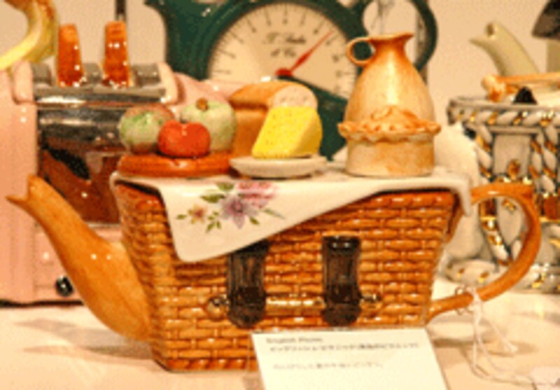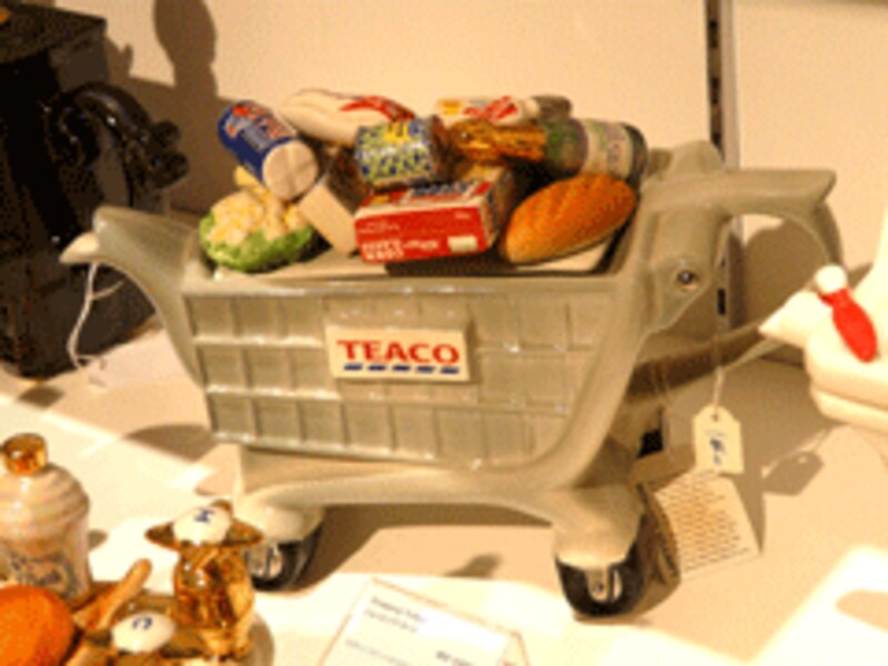 英国を代表するスーパーマーケットをもじったと思われるロゴのTEACO。たくさんの食料がのせられたショッピングカートの形をしたティーポット。