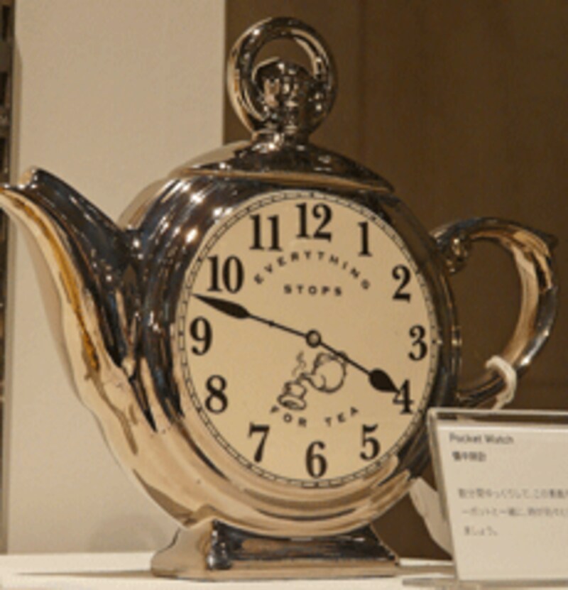 “Everything stops for tea.(すべてが紅茶のために止まる)” と文字盤に刻まれ、時計が指しているのはまさに、午後のティータイムを知らせる4時10分ちょっと前。いつでもティータイム気分にさせてくれそうなティーポット。