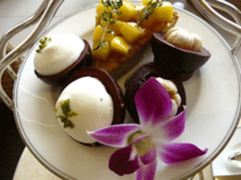 一番上の段には、マンゴスチンとマンゴー。堅く分厚い果皮に包まれたマンゴスチンは2つにカットされ、フレッシュな果実をこのままパクッといただきます。そして空になったもう一方の果皮には、ココナツのムースがこんもりと実のような様子で盛りつけられています。