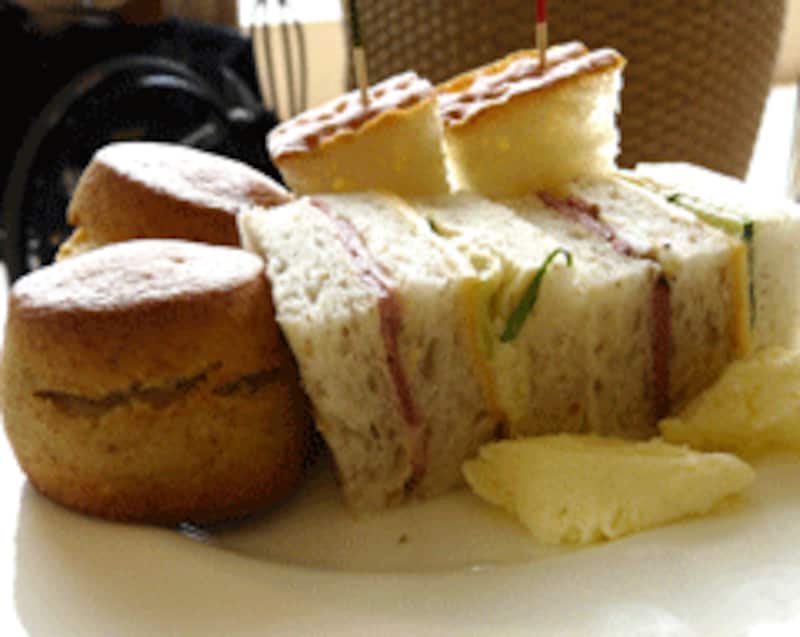 一番下の段には、全粒粉のスコーンと2種類のサンドイッチ。グリルしたズッキーニやトマトを挟んだフォッカチャサンドは、チーズソースやジェノバペーストの酸味がききさっぱり。パストラミとチーズ、レタス、キュウリのサンドイッチは厚めにスライスされた全粒粉のボリュームあるサンドイッチ。