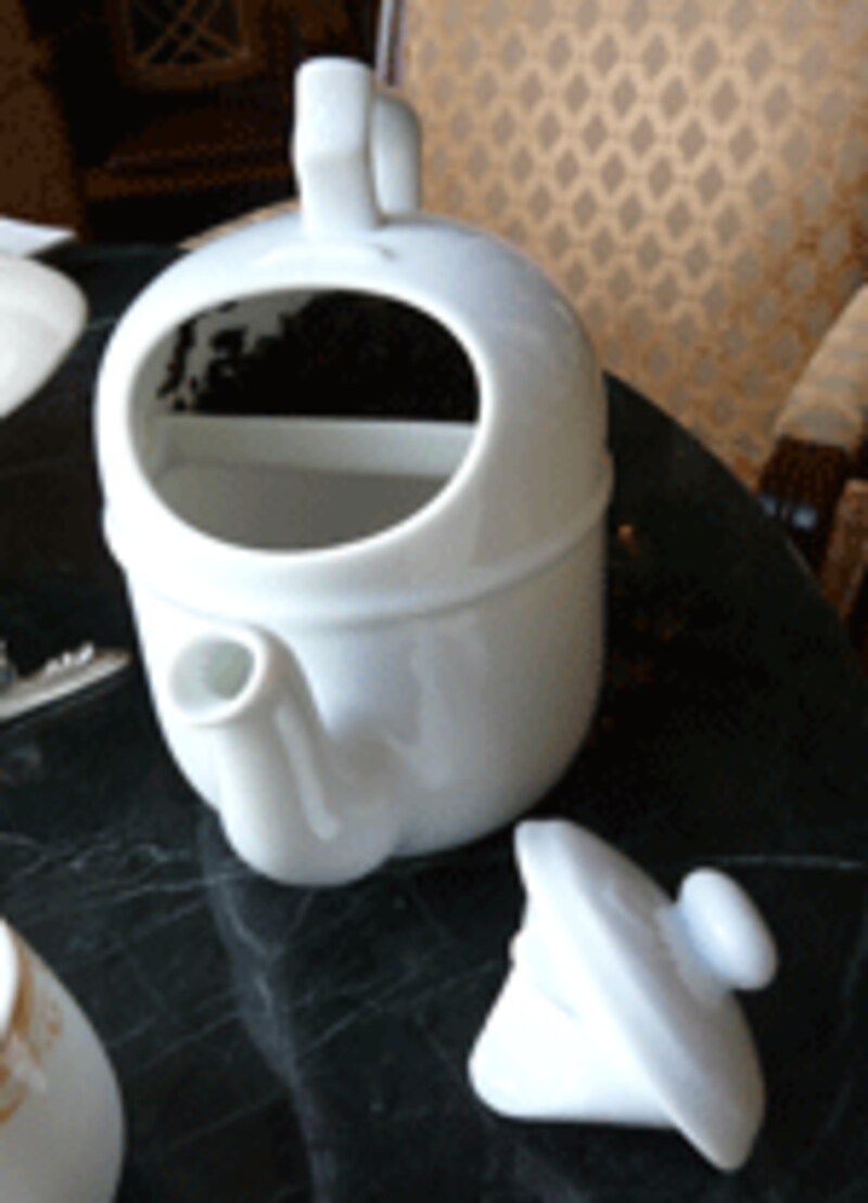 | おもしろい仕様のティーポット。使い方を教わって自分で入れて楽しんでみてください。紅茶の追加も無料にてお願いできるとのこと。 |