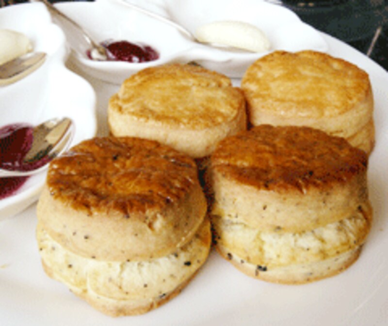 | 手前が“ストロベリーガーデンティー”が練りこまれたスコーン。写真は2人分。 |