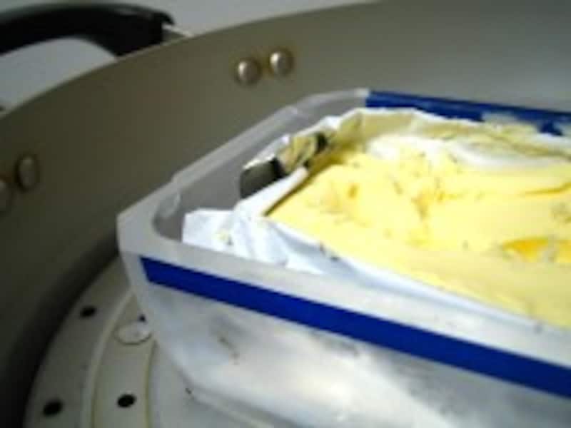 | 1.ガラスのボール(小)にブラウンシュガー、エバミルクをいれ、ラップをしたら蒸し器で蒸してブラウンシュガーを溶かします。その後に、冷やして重曹を加えましょう。 | 2.別の器にバターとサラダ油を入れ、これも同様に溶かします。 | |