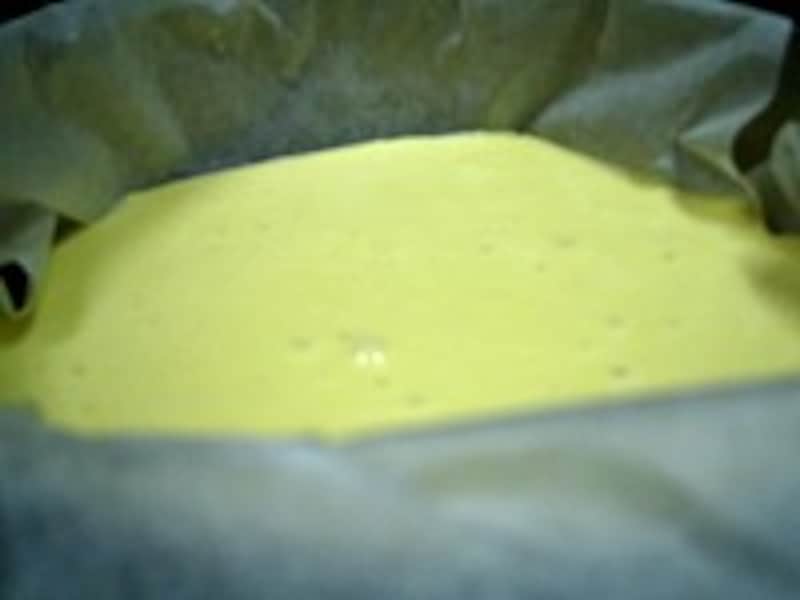 | 3.◎の材料をすべてボールで混ぜ合わせ、解き解した卵を加え、よく混ぜます。決めの細かい仕上がりにするためには、一度ザルで漉すといいそうです。 | 4.3の粉類にブラウンシュガーを溶かしたエバミルクを加えた後、バター&サラダ油を暖かいうちに少しずつ入れ、混ぜ合わせます。 | |
