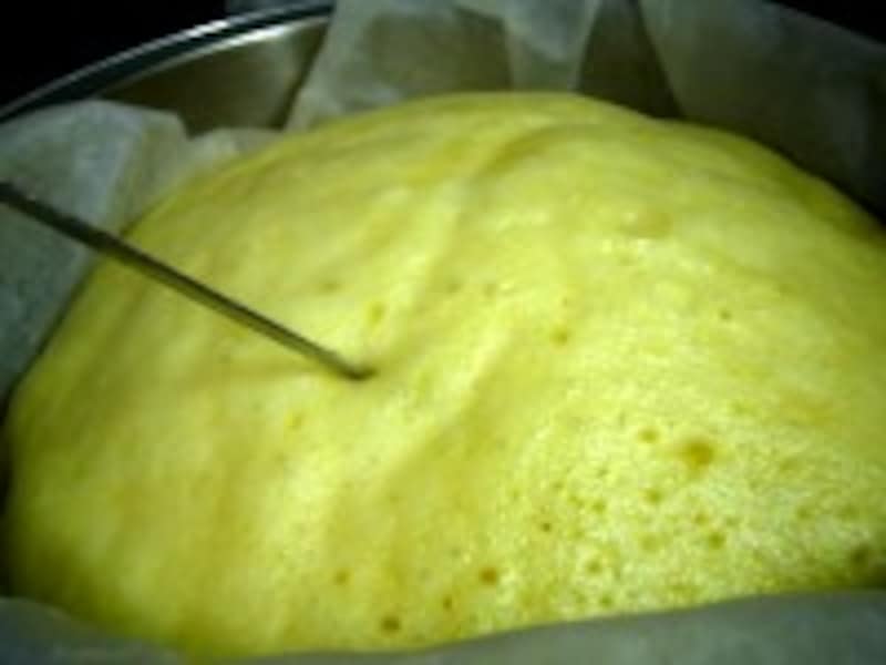 | 5.出来上がったベースをクッキングシートを敷いた形に流し込み、蒸し器で蒸し揚げます。蒸気が上がってから強火で25分程度を目安にすると良いようです。 | 6.中央に竹串を刺してみて、生っぽい生地がついてこなければ出来上がり。あつあつでも、冷ましてもおいしく食べられます。 |