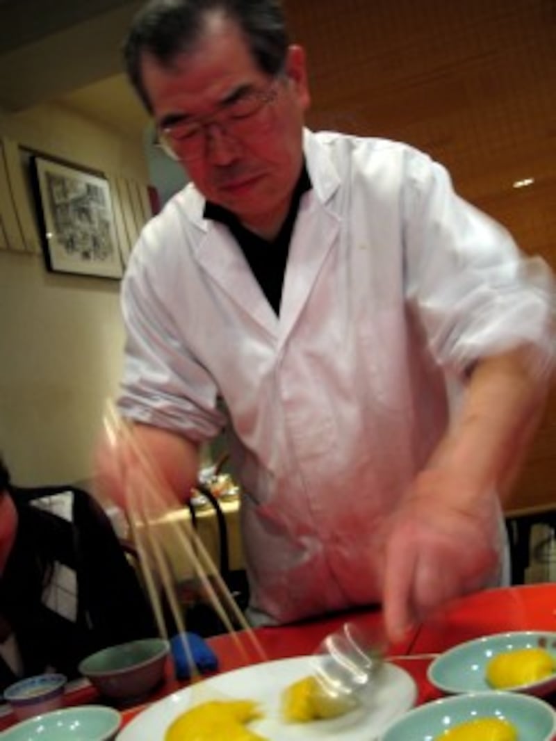 | 三不粘を取り分けて くれる龍水楼のご主人 |