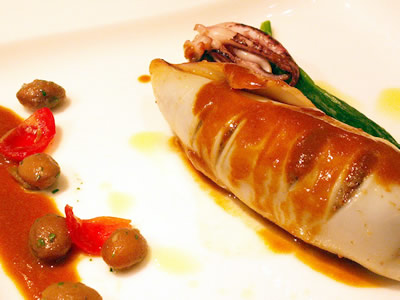 このヤリイカの中にたっぷり詰められているのは、ちょうどフランスのリエットのように、しっとりと綿のように柔らかくほぐれた牛肉。プリッとしたイカとビーフのふわふわな食感のコントラスト、そこにコロコロと添えられたインゲンはアクセントになる。同席者たちを見ると「イカと牛??」と意外そうなようす。いつもの安心メニューもいいが、こんな驚きがある料理も愉快ではないか。「牛肉のグアンチャーレを詰めたヤリイカ 薪釜仕立てのサルッジーニ産インゲン豆と共に」である。![]() |