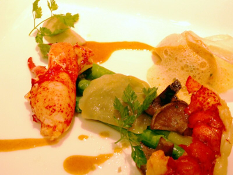 大ぶりなハサミと尾の身を盛り合わせ、コライユ(いわゆる脳味噌)はひらりと薄いラビオリ詰め、細かい身は肉団子のようにほろほろと固めてソーセージ仕立てでフワフワと泡のソースを載せてある。
