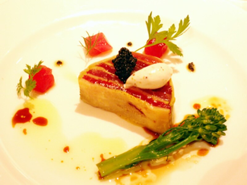 これをマグロの赤身と合わせたのだが、マグロ赤身の酸味と呼応するかと思いきや、そうでもない。先ほどのカワハギの方が合うかもしれない。スパリュア氏も「この料理はおいしいけれど、油分やコクがあるのでシャトー・モンテレーナにはリッチ過ぎるかもしれない。魚ならどちらかと言えば白身、サンピエール(的鯛)などが合うのでは?」という。