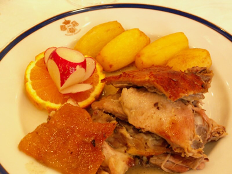 この辺りの名物料理といえばなんと言っても仔豚のローストである。丸ごとワイルドな姿で出てくるのかと思いきや、皮と肉を銀盆に盛り付け、ワゴンから取り分けてくれる。皮は塩味が効いてパリパリと香ばしく、蒸し焼き状になった皮の下そして肉の部分は肉汁が豊富に含まれている。見た目は北京ダックに似ているが甘味はなく、強めの塩味でシンプルに素材の旨味を際立たせるというポルトガルらしい手法である。