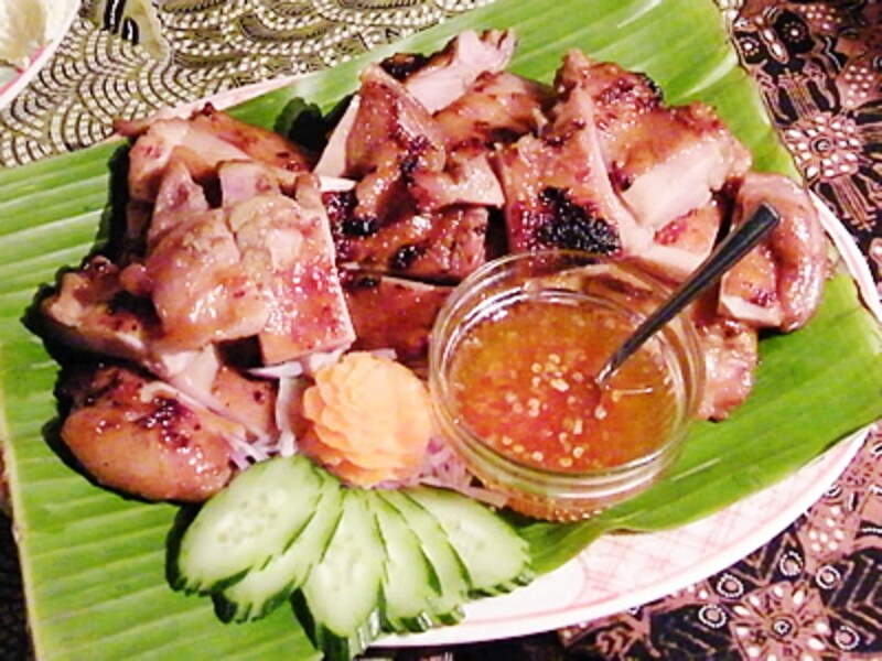 | ガイ・ヤーン(鶏のあぶり焼き)には飾り彫りを施した野菜が飾られ、甘味と辛味のきいたタレが添えられている |