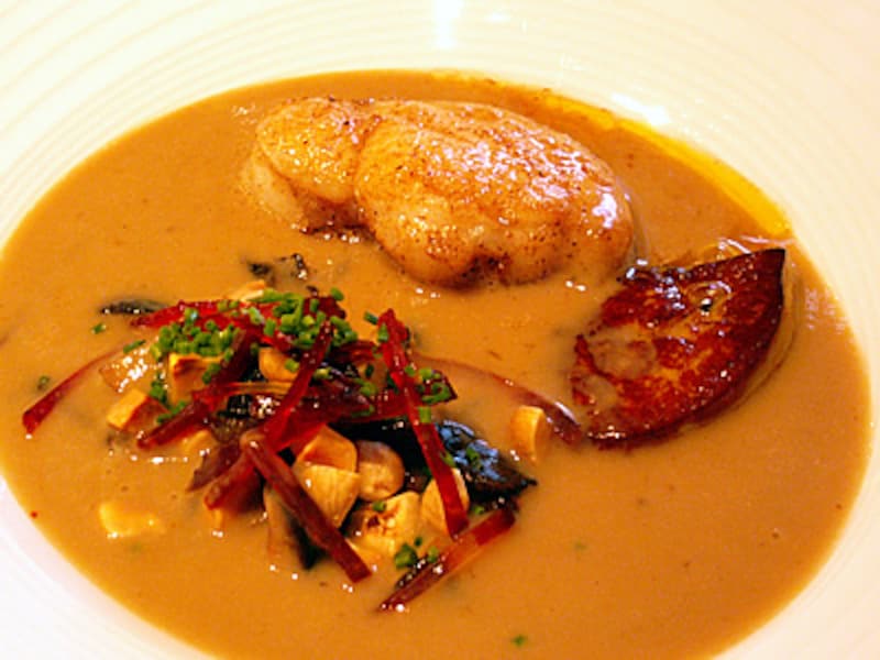 ソースに浸ったアンコウは巧みな加熱で肉汁を抱え込み、喩えて言えば柔かい豚ロース肉ぐらいの弾力でプリプリッと張りつめている。フォアグラは表面にさっと火を通し中はとろりとクリーミー。キノコのソテーも噛めば汁があふれ出す。こうした多彩な食材の盛り合わせが、注がれたヴルーテによって一体となる。