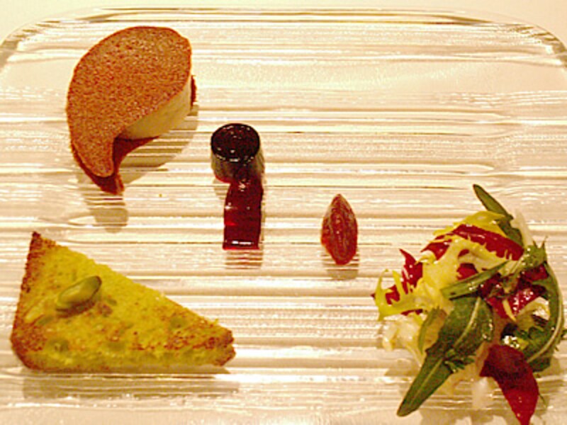 薄ピンク色にねっとりと仕上がった鴨のフォアグラが、セップ茸のチュイル(薄焼き生地)で挟まれている。赤ワインのジュレ(ゼリー)をリボンのように巻き、となりにイチジクとオレンジを煮詰めたマルムラード、手前側にはピスタチオ入りのブリオッシュそしてほろ苦い葉をフランボワーズのヴィネグレットで和えたサラダが配置されている。