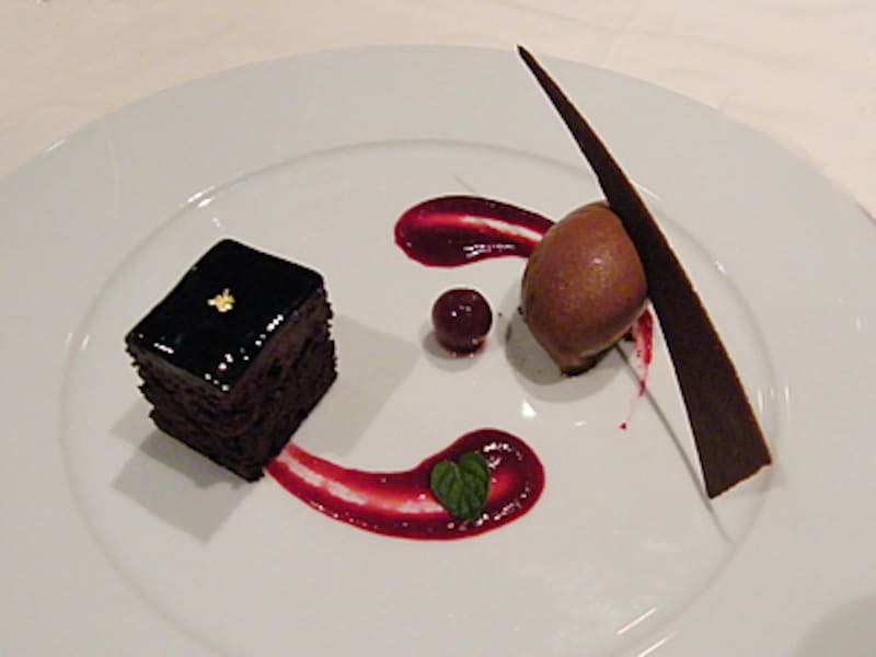 最後のデザートは『ビターチョコレート“エベヌ”のガトー』。これもオレキスの定番デザートである。レストランのデザートとしてオリジナリティーの高いものを提供するのが、シェフのこだわりである。ヴェイス社のクーベルチュール(加工用チョコレート)の一種『エベヌ』(カカオ含有量72%)を使用した、濃厚でなめらかな味わいのチョコレートケーキである。エベヌは品質的に優れた希少なカカオ品種のクリオロをベースに、トリニタリオとフォラステロという他のメジャー品種もブレンドしている。皿の上のパーツそれぞれにカカオを感じさせる香りやざらりとした感触があり、酸味や甘味も充分でくっきりとした味わいは、これもかなりフランスに近い感性である。