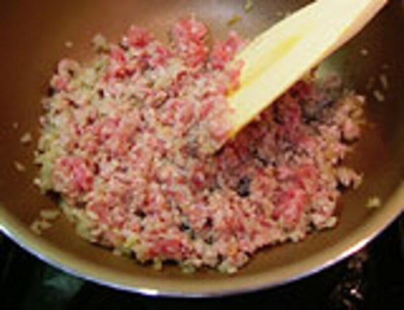 | 2 | タマネギに火が通ったら、挽き肉を加え、ほぐすように炒める。 軽く塩、コショウをふる。 |