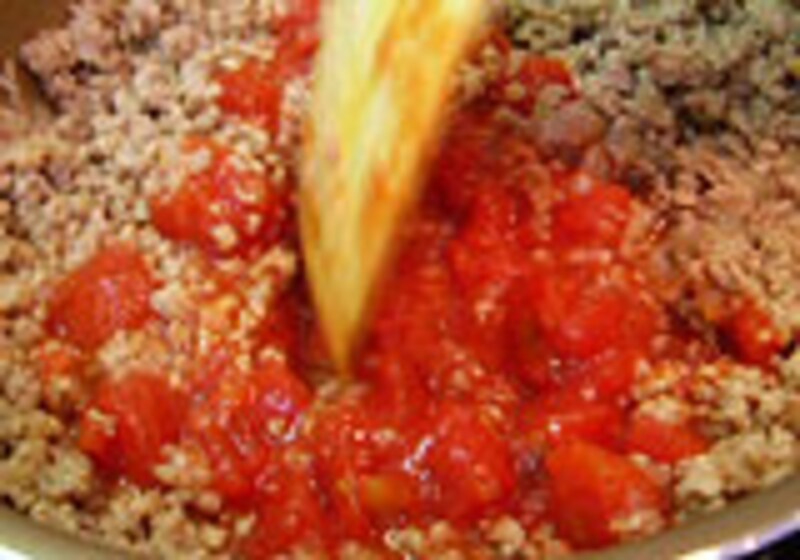 | 3 | 挽き肉をじっくり炒めたら、トマトの水煮を加え、木べらの先でほぐしながら混ぜ合わせる。 |