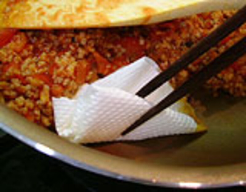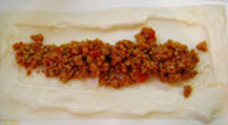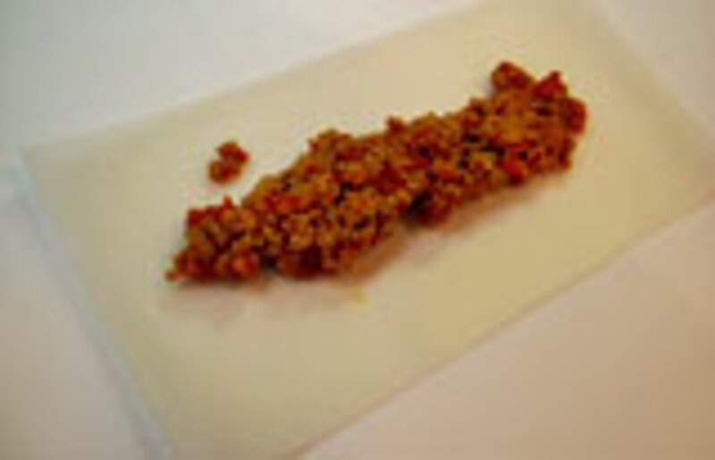 | 5 | 春巻きの皮を半分に切る。 その上に4の具を細長くのせ、ガラムマサラ、カイエンペッパーをふる。 ■「具に油分が多いと、春巻きの皮の表面に沁みてしまうので、しつこいくらい丁寧にキッチンペーパーで油をとりのぞいてから、のせてくださいね」 |