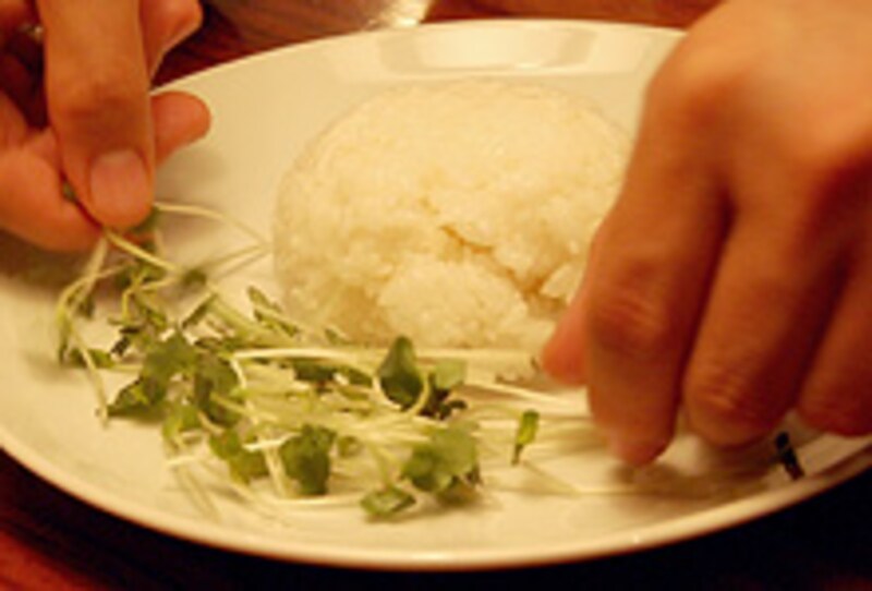2: 洗って根もとを切り落とした貝割れ大根を、ごはんの周囲にちらす。