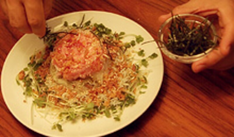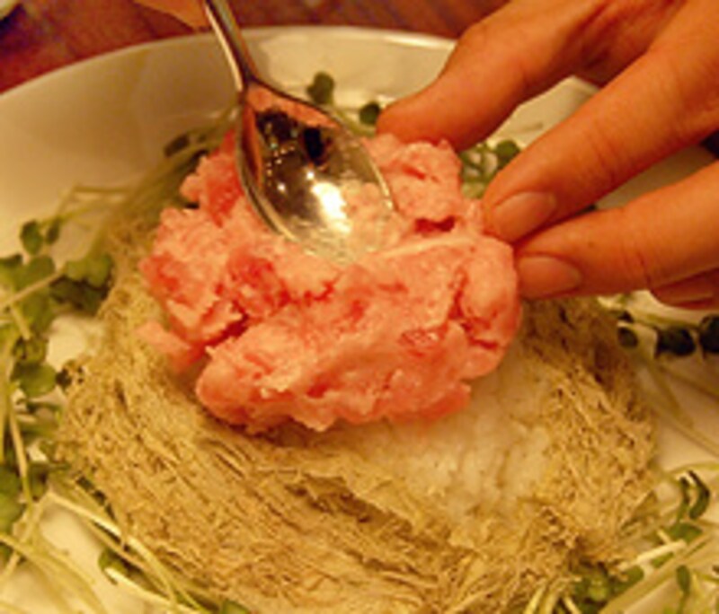 5: ごはんの上にマグロの中おちをのせ、中央にティースプーンでくぼみを作っておく。