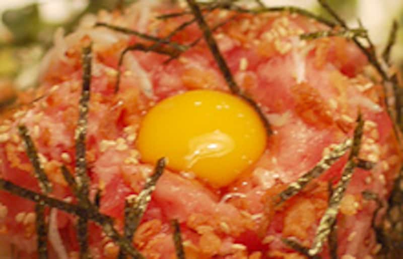 9: 小さな器にウズラのたまごを割り入れ、マグロの中おちの中央のくぼみをつけた部分に、そっと入れて完成。