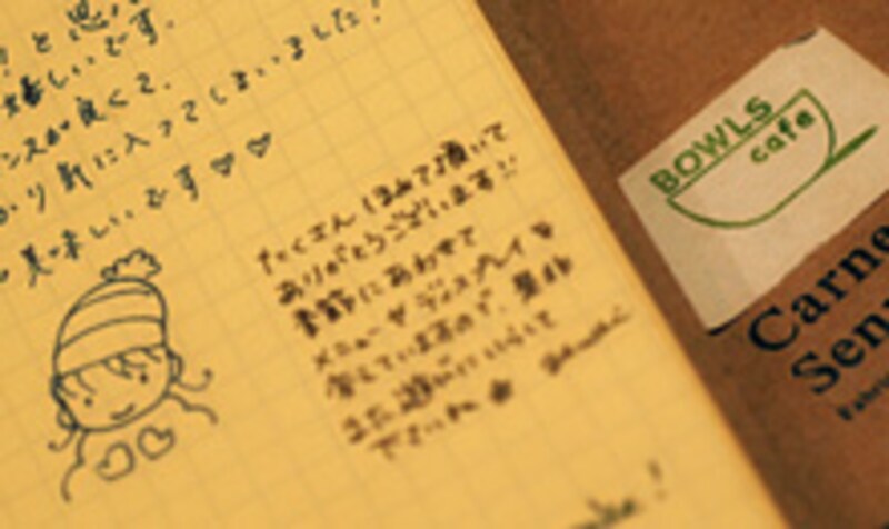 小さな書架のコーナーには、さまざまな本に混じって4冊のノートが並んでいます。ページをひらくと、2004年8月のオープン以来、お店を訪れたお客さまが残していった言葉やイラスト、それらにひとつひとつ丁寧に答えていくオーナー二人のコメントを読むことができます。
